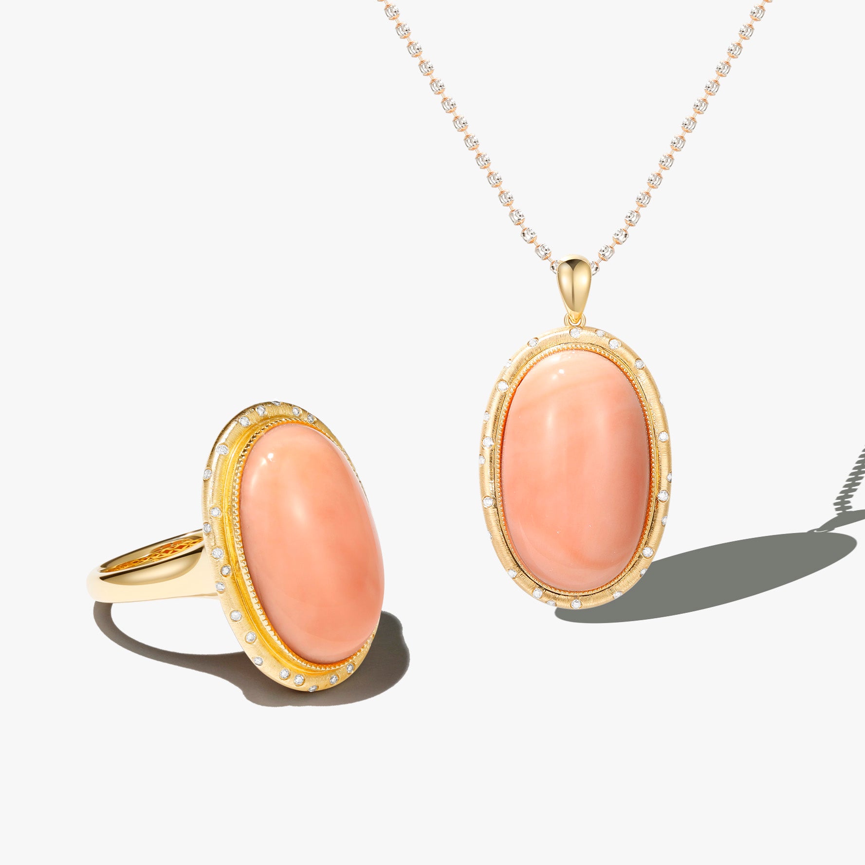 This stunning necklace features a combination of 14K and 18K yellow gold and diamond-encrusted pink coral. The classic design and exceptional craftsmanship make this piece a timeless piece for any jewelry collection.