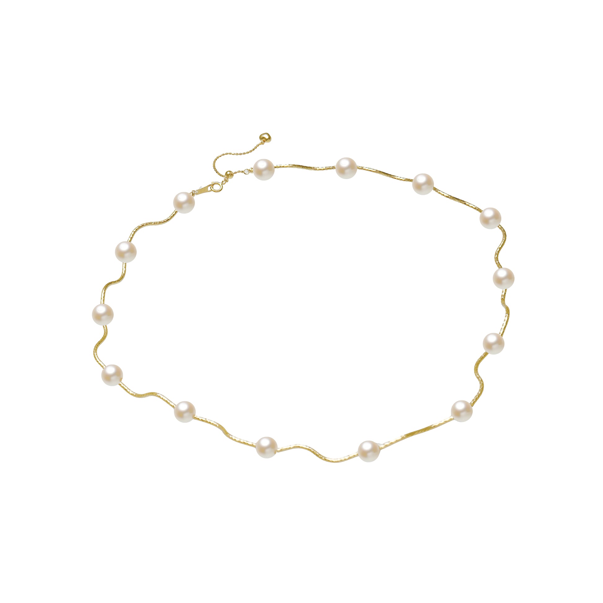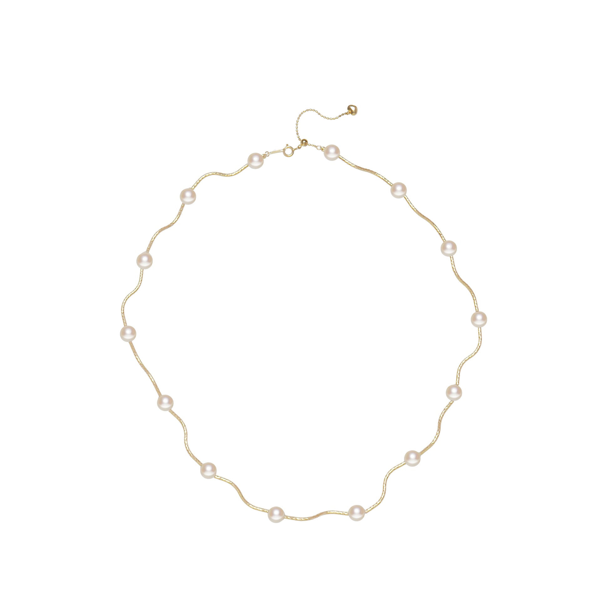 This gold necklace has pearls perfectly spaced for timeless beauty and style. A fashion staple. Wear alone or layer with endless possibilities.